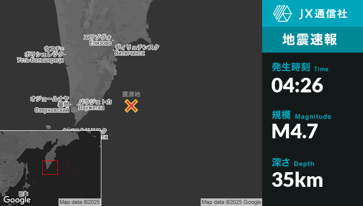 10月22日 04:26頃、ロシアのVilyuchinskから南南東165kmの地点でM4.7の地震がありました。