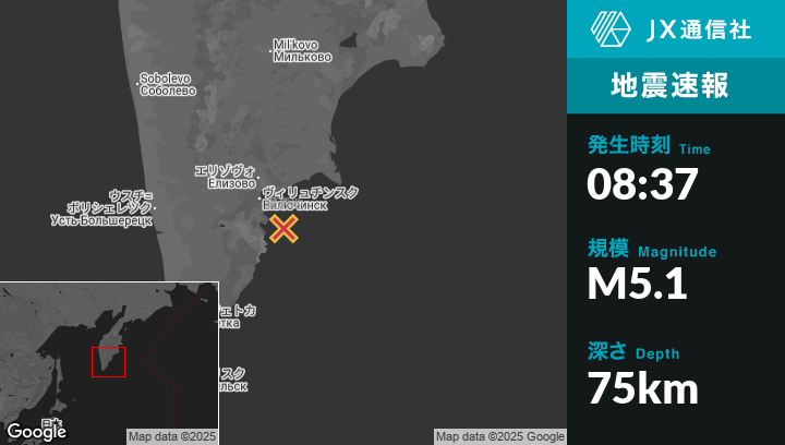 10月22日 08:37頃、ロシアのVilyuchinskから南東45kmの地点でM5.1の地震がありました。