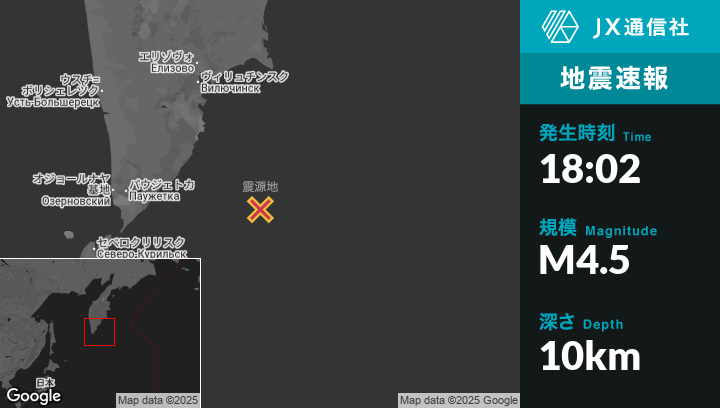 10月23日 18:02頃、ロシアのVilyuchinskから南南東205kmの地点でM4.5の地震がありました。