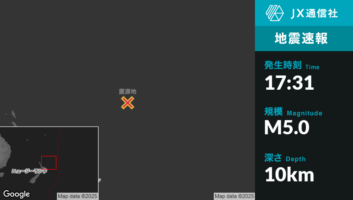 10月24日 17:31頃、ニュージーランドのHicks Bayから北東291kmの地点でM5.0の地震がありました。