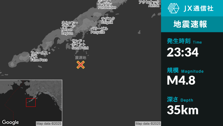 10月24日 23:34頃、アラスカのSand Pointから南南東94kmの地点でM4.8の地震がありました。