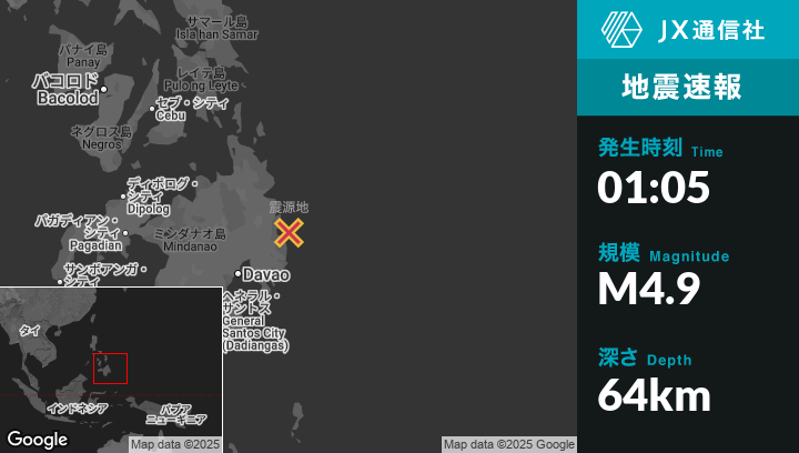 10月25日 01:05頃、フィリピンのSanta Mariaから東17kmの地点でM4.9の地震がありました。