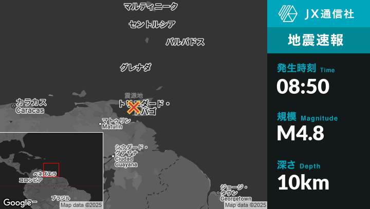 10月25日 08:50頃、トリニダード・トバゴのMucurapoから西南西27kmの地点でM4.8の地震がありました。