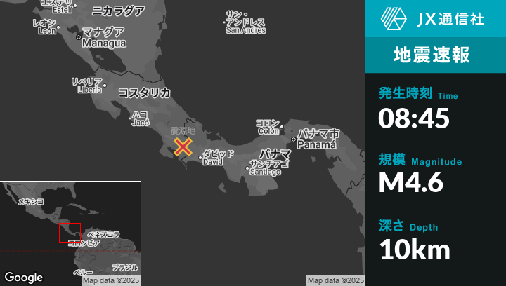 | 震源地 | コスタリカのSan Vitoから北北西5kmの地点 |