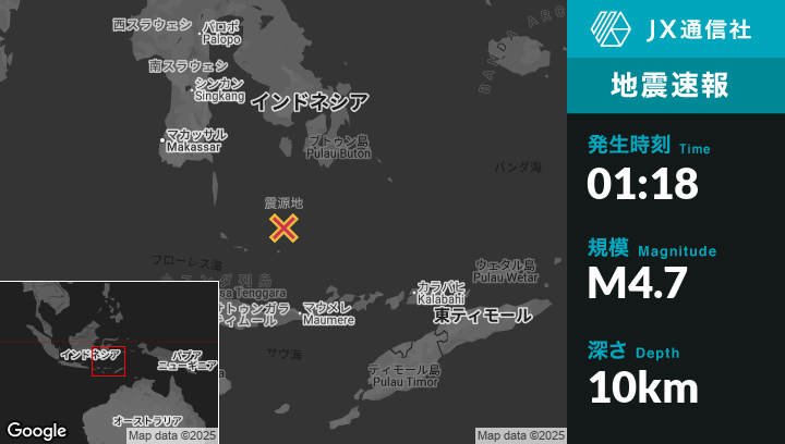 | 震源地 | インドネシアのBaubauから南南西167kmの地点 |
