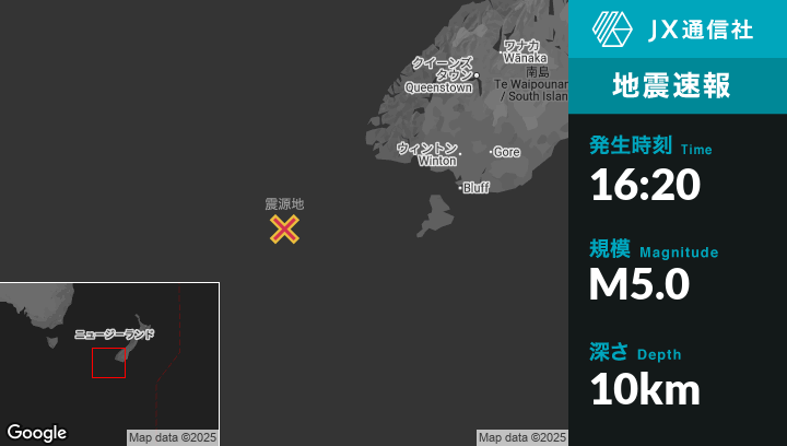 | 震源地 | ニュージーランドのRivertonから西南西260kmの地点 |