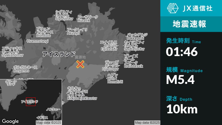 | 震源地 | アイスランドのHöfnから西北西105kmの地点 |