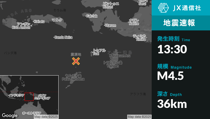 | 震源地 | インドネシアのTualから西南西147kmの地点 |