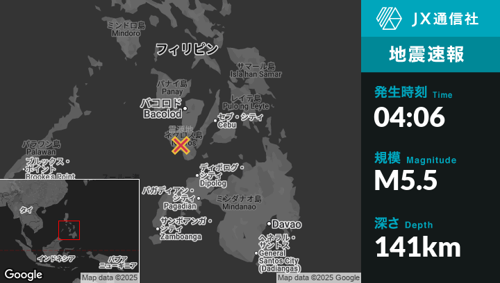 11月03日 04:06頃、フィリピンのMabinayから南西13kmの地点でM5.5の地震がありました。