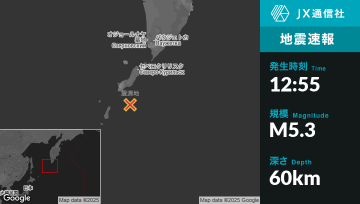 11月03日 12:55頃、ロシアのSevero-Kuril’skから南南西106kmの地点でM5.3の地震がありました。