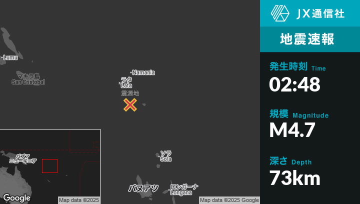 | 震源地 | ソロモン諸島のLataから南南東103kmの地点 |