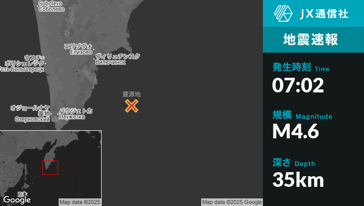11月06日 07:02頃、ロシアのVilyuchinskから南東170kmの地点でM4.6の地震がありました。