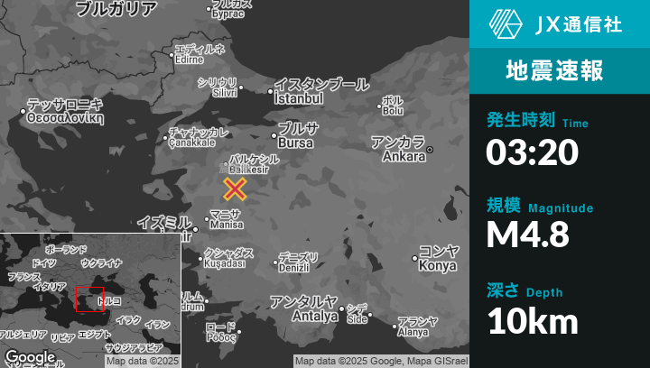 11月11日 03:20頃、トルコのSındırgıから北西8kmの地点でM4.8の地震がありました。