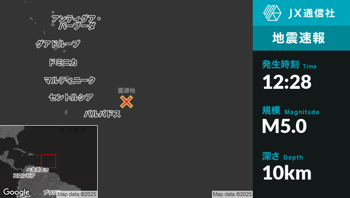 | 震源地 | バルバドスのCraneから北東134kmの地点 |