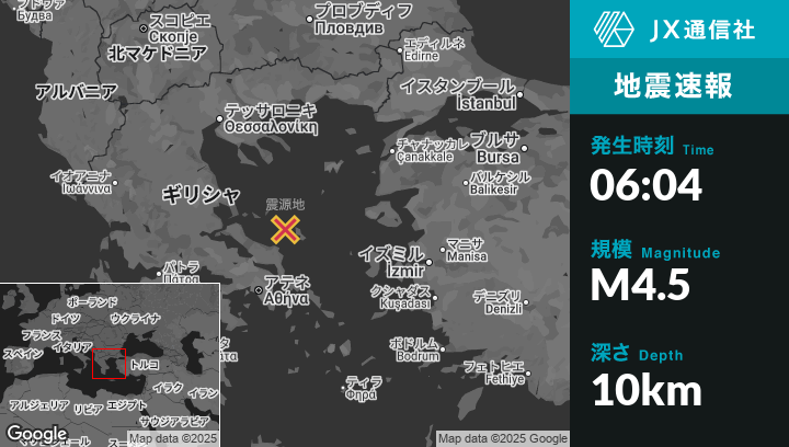 11月18日 06:04頃、ギリシャのSkýrosから西北西29kmの地点でM4.5の地震がありました。