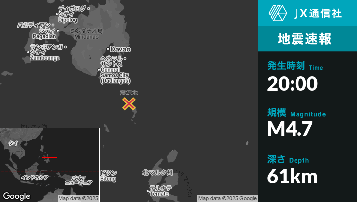 | 震源地 | フィリピンのSaranganiから東南東138kmの地点 |