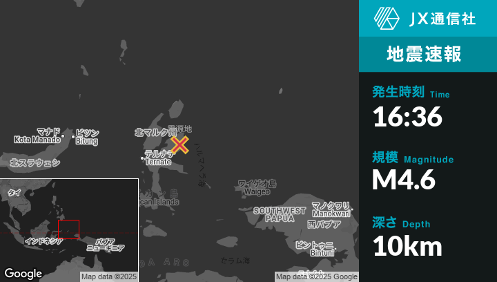 | 震源地 | インドネシアのMabaから北北東74kmの地点 |