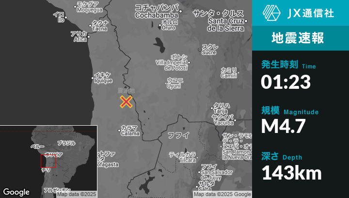 11月24日 01:23頃、チリのOllagüeから西北西40kmの地点でM4.7の地震がありました。
