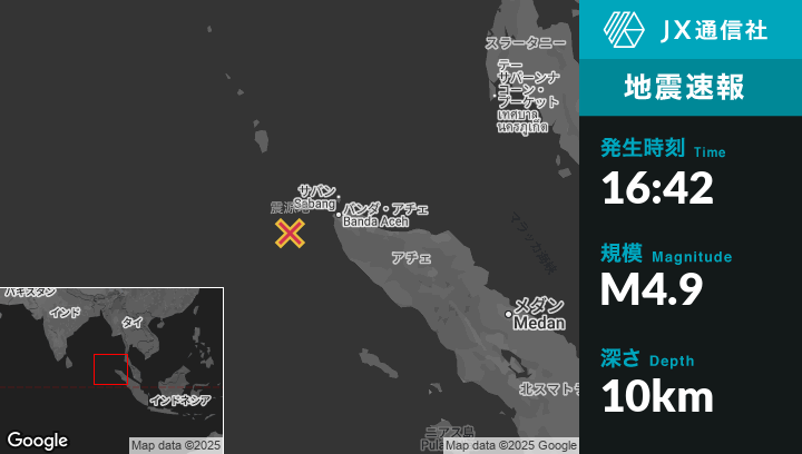 | 震源地 | インドネシアのBanda Acehから西南西111kmの地点 |