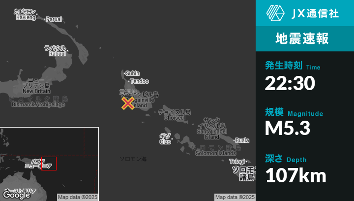 震源地パプアニューギニアのPangunaから西69kmの地点