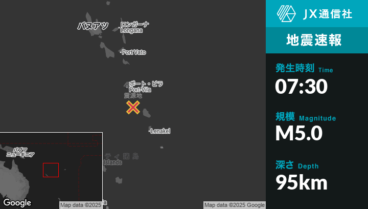 震源地バヌアツのPort-Vilaから南南東84kmの地点