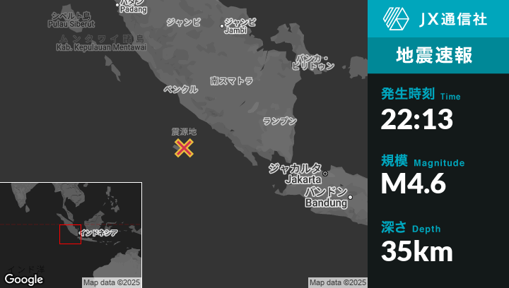 | 震源地 | インドネシアのBengkuluから南162kmの地点 |