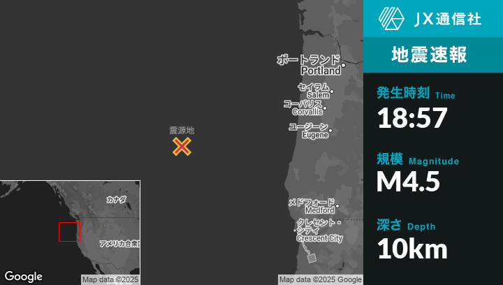 | 震源地 | オレゴンのBandonから西北西281kmの地点 |