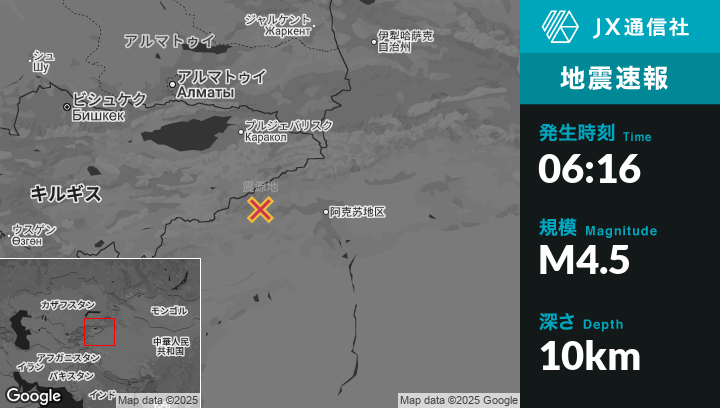 12月22日 06:16頃、中国のAykolから西北西117kmの地点でM4.5の地震がありました。