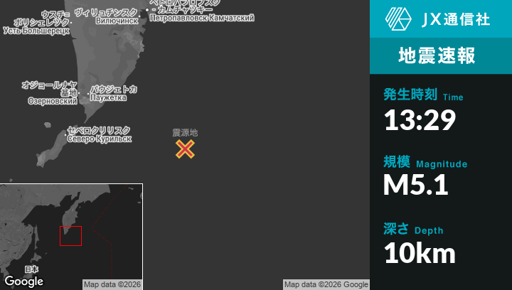 | 震源地 | ロシアのOzernovskiyから東南東258kmの地点 |
