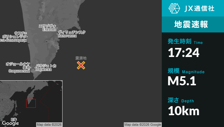 1月28日 17:24頃、ロシアのVilyuchinskから南東181kmの地点でM5.1の地震がありました。