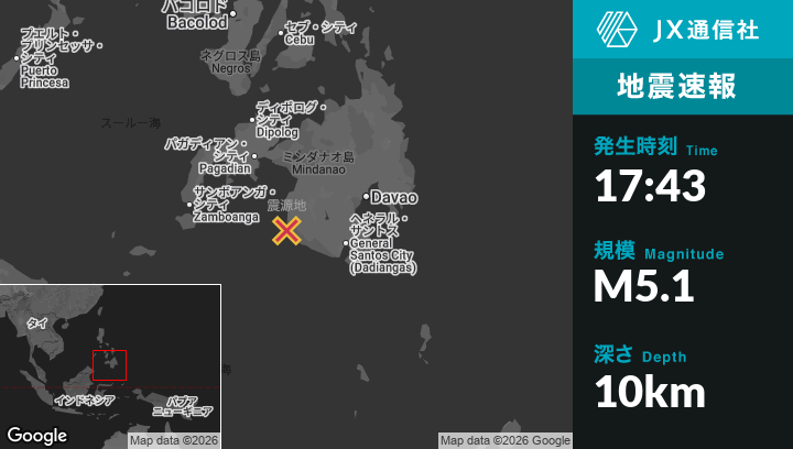 1月28日 17:43頃、フィリピンのBantogonから南西3kmの地点でM5.1の地震がありました。