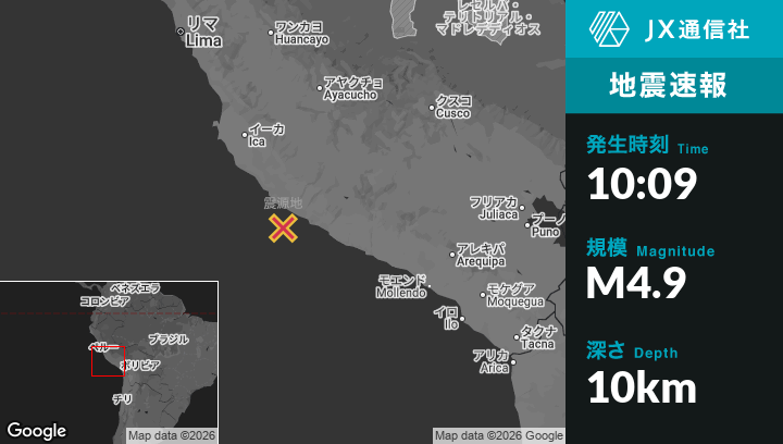 1月31日 10:09頃、ペルーのSan Juanから南南東50kmの地点でM4.9の地震がありました。
