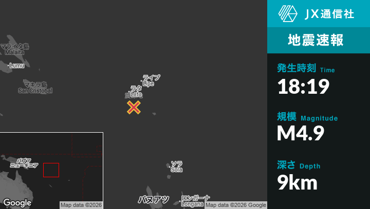 | 震源地 | ソロモン諸島のLataから南南東64kmの地点 |