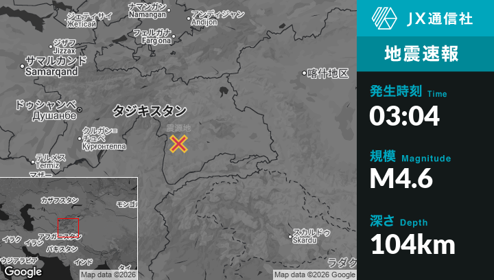 2月02日 03:04頃、タジキスタンのKhorughから北東50kmの地点でM4.6の地震がありました。