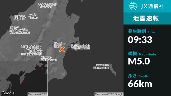 | 震源地 | ロシアのKlyuchiから東南東51kmの地点 |