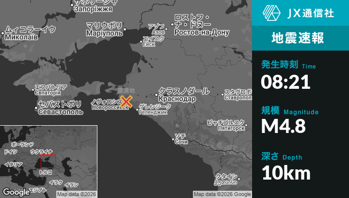 2月10日 08:21頃、ロシアのVerkhnebakanskiyから北西8kmの地点でM4.8の地震がありました。