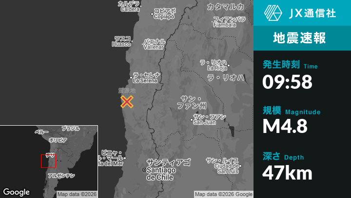 2月13日 09:58頃、チリのOvalleから西南西28kmの地点でM4.8の地震がありました。