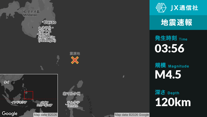 2月14日 03:56頃、インドネシアのTobeloから北282kmの地点でM4.5の地震がありました。