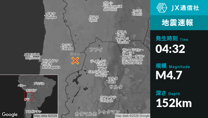 | 震源地 | チリのSan Pedro de Atacamaから南東57kmの地点 |