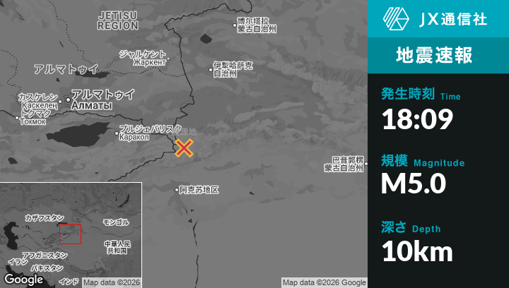 2月19日 18:09頃、中国のAksuから北118kmの地点でM5.0の地震がありました。