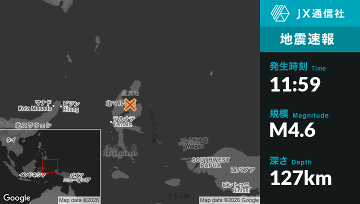 2月20日 11:59頃、インドネシアのTobeloから東南東24kmの地点でM4.6の地震がありました。