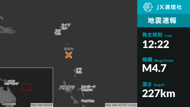 2月20日 12:22頃、バヌアツのSolaから北北西167kmの地点でM4.7の地震がありました。