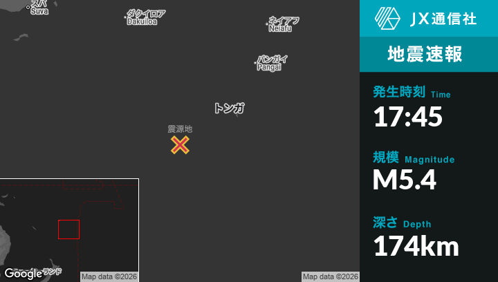 2月22日 17:45頃、トンガのHoumaから南西183kmの地点でM5.4の地震がありました。