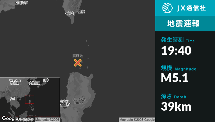 2月22日 19:40頃、フィリピンのNamuacから北84kmの地点でM5.1の地震がありました。