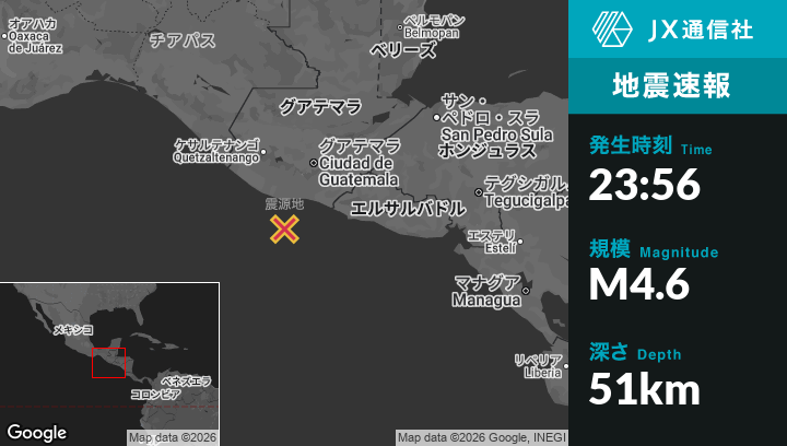 2月22日 23:56頃、グアテマラのPuerto San Joséから南南西60kmの地点でM4.6の地震がありました。