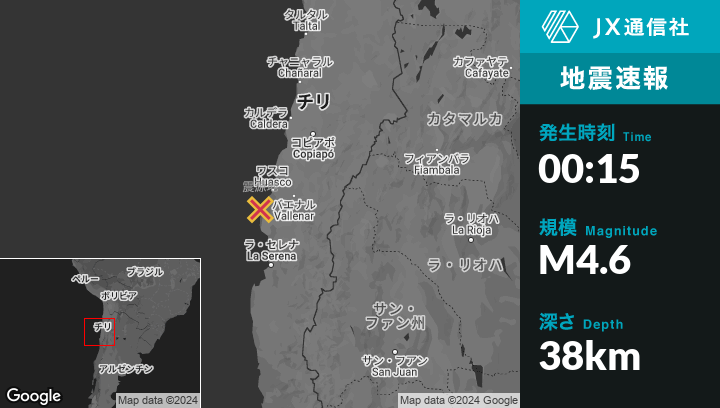 11月09日 00:15頃、チリのVallenarから西南西74kmの地点でM4.6の地震がありました。
