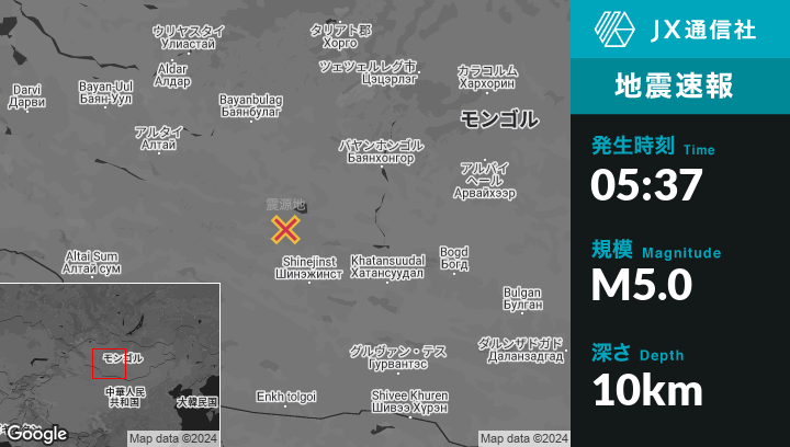| 震源地 | モンゴルのBayanhongorから西南西175kmの地点 |