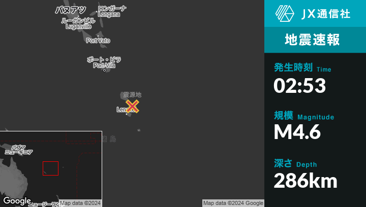 | 震源地 | バヌアツのIsangelから北北東54kmの地点 |