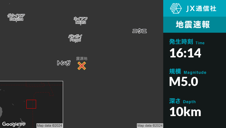 | 震源地 | トンガの‘Ohonuaから東109kmの地点 |