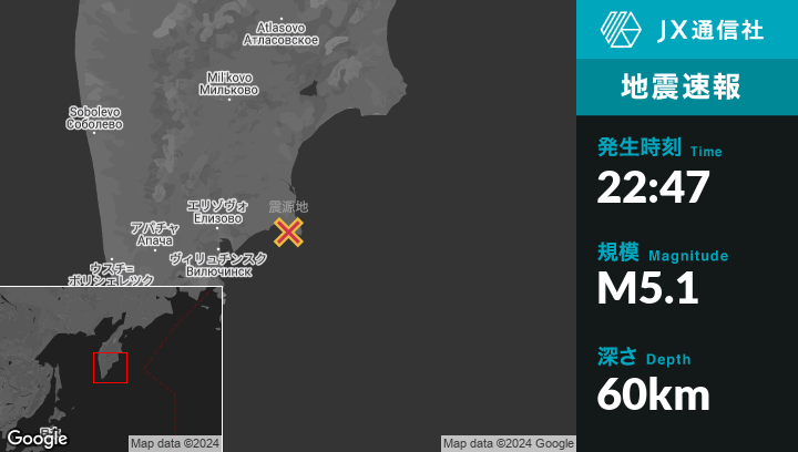 | 震源地 | ロシアのPetropavlovsk-Kamchatskyから東北東78kmの地点 |